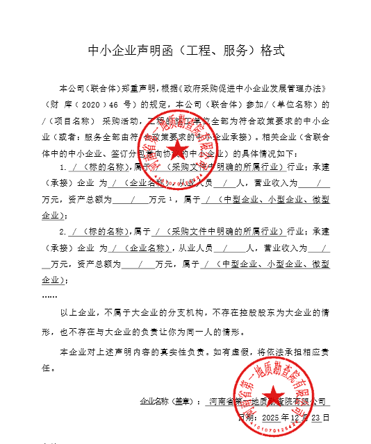 一、项目基本情况 1、采购项目编号:南阳政采公开-2025-95 2、采购项目名称:南阳市生态环境局丹江口库区及上游(南阳区域)历史遗留矿渣调查项目 3、采购方式:公开招标 4、招标公告发布日期:2025年11月28日 5、评审日期:2025年12月23日 二、采购项目用途、数量、简要技术要求、合同履行日期: 1、采购内容:完成现场踏勘、物探、钻探、测量、样品采集与分析、基础环境信息调查等野外工作,精准排查流域范围内全部历史遗留矿渣的位置、数量、矿渣种类、面积、埋深、规模等情况,建立“一图一表”清单目录;采取“一区一策略、一点一方案”布设采样点位,采集土壤、灌溉水、底泥等样品,进行测试分析,初步查明历史遗留矿渣堆存量和重金属等污染物的分布、含量情况,计算各种重金属元素总量和影响农用地的范围、面积,开展农用地受污染类型分类和受污染状态分级,总结不同类型矿渣对周边环境的影响程度综合分析丹江口库区及上游(南阳区域)历史遗留矿渣对周边环境的影响,建立污染源清单,编制完成调查报告并通过评审。